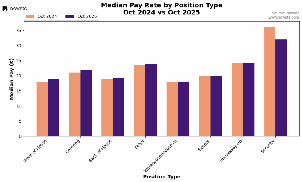 Front of House (FOH), Catering, and Back of House (BOH) positions saw the greatest year-over-year increases in hourly wages. The surge in pay for these roles points to high demand and a potential shortage of specialized labor. As events and hospitality continue their strong recovery, businesses are competing for experienced staff to manage kitchens, maintain facilities, and execute high-quality service.