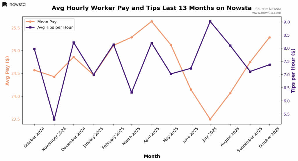 Although the annual average is stable, tips do fluctuate monthly. Our data shows a typical range between $7 and $9 per hour. This past October, for instance, the average came in at $7.48 per hour. These fluctuations are often tied to seasonality, event volume, and consumer spending patterns.